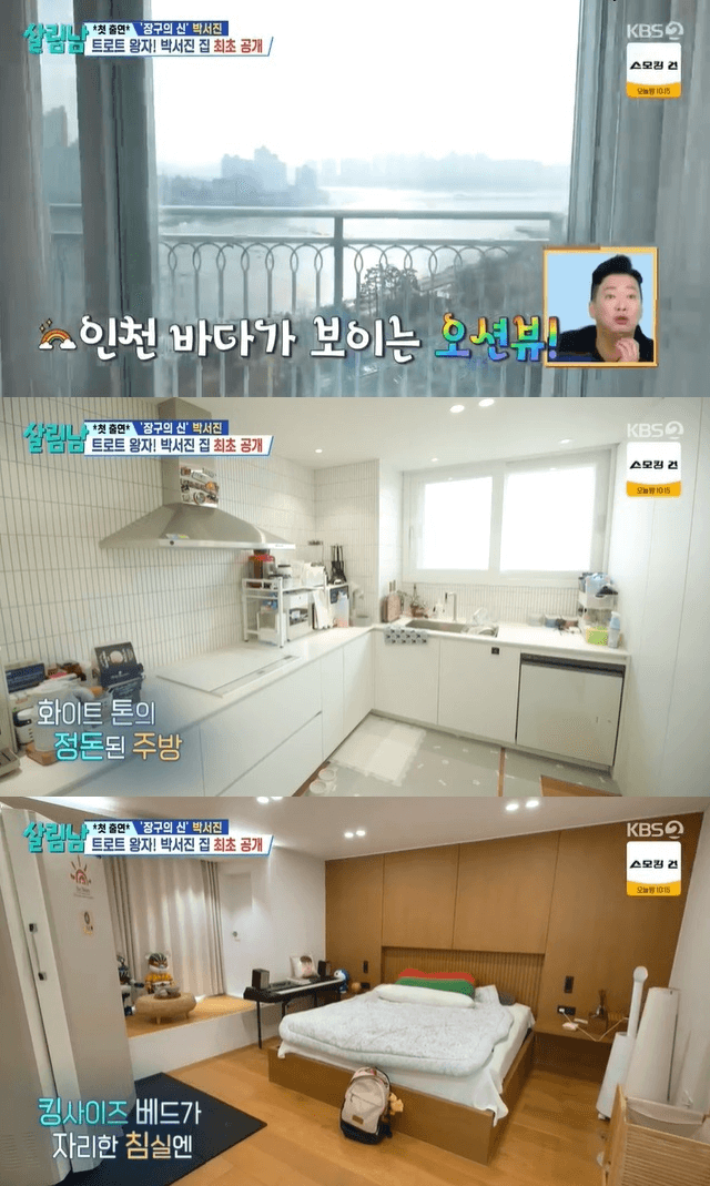 박서진은 인천 바다가 보이는 집을 최초로 공개했습니다. 긴 복도를 지나 공개된 널찍한 거실과 화이트톤의 아기자기한 주방에 이어 킹사이즈 베드가 자리한 침실에는 키보드 피아노가 마련돼 있는 모습이었는데요. 화장대에는 많은 종류의 화장품이 가득했고, 벽 한 구석에는 화이트 태닝 기계까지 갖춰져 있었습니다.