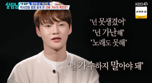 박서진은 당시 돈을 벌어야겠다는 생각만 하면서도 꿈을 포기하지는 않았다고 하는데요. 힘든 가정 환경의 영향으로 성격이 어두워졌다면서 "눈을 못 쳐다보는 것 때문에 활동하면서 선배님들한테 오해도 많이 받았다"고 털어놨습니다. 박서진은 한 선배가 대뜸 전화를 걸어 “너처럼 못생기고, 집안에 돈이 없고, 노래 못하면 가수 하지 말아야 된다”는 폭언을 했다고 전해 안타까움을 자아내게 만들었습니다.
