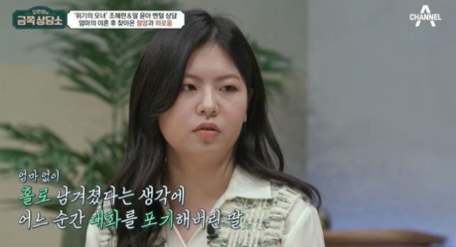 딸 윤아는 엄마의 이혼 후, 속마음을 말하면 무거워지는 분위기가 싫어 "겉으로라도 잘지내고 싶다는 마음이 들었다"라며 그동안 속마음을 고백하지 못했던 이유를 밝혔는데요.